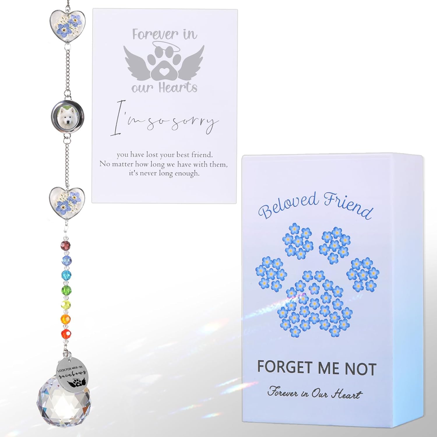 - THOUGHTFUL DOG MEMORIAL GIFTS: This pet memorial gift, presented in an exquisite packaging box, with a sensitive pet sympathy card. Meaningful pet memorial gifts for dogs/cat, which serves as a source of comfort for a gesture of care and solace for friends who have lost their beloved pets.