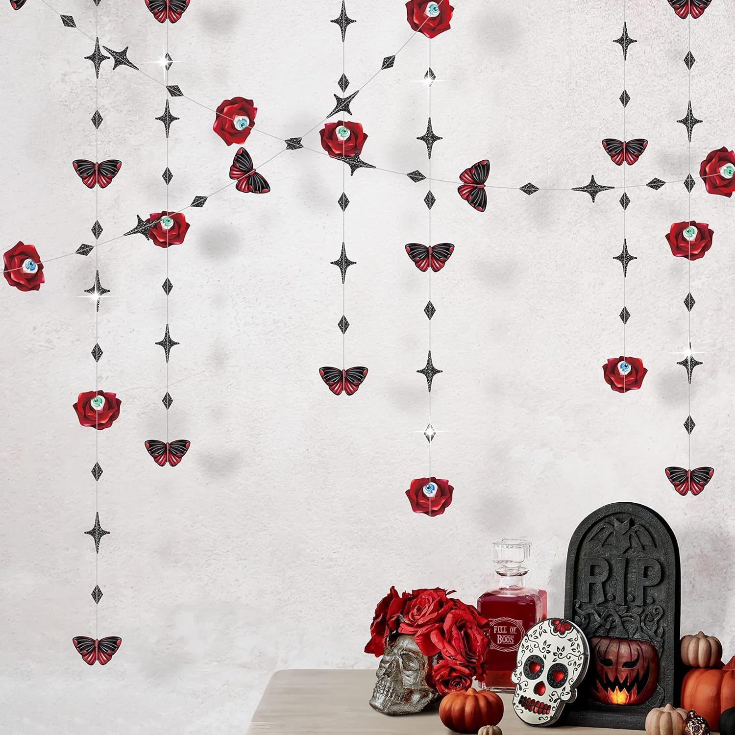 - Package: This set includes 4 Halloween garlands featuring red rose garland, eyeballs, blood butterflies, and black four-point cross stars. Each garland measures 7, 7.7 ft long, with roses and butterflies 3 inches wide, creating a mesmerizing gothic party decoration and star garland decoration effect perfect for spooky celebrations.