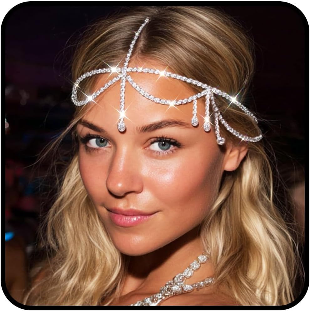 JEAIRTS Silver Rhinestone Head Chain Jewelry Sparkly Bridal Crystal Headpiece for Women