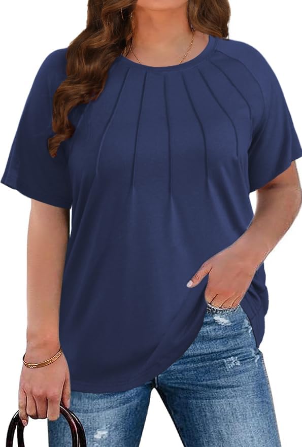 Plus Size Blouses for Women Pleated Casual Short Sleeve Round Neck Shirts Dressy Loose Summer Tops
