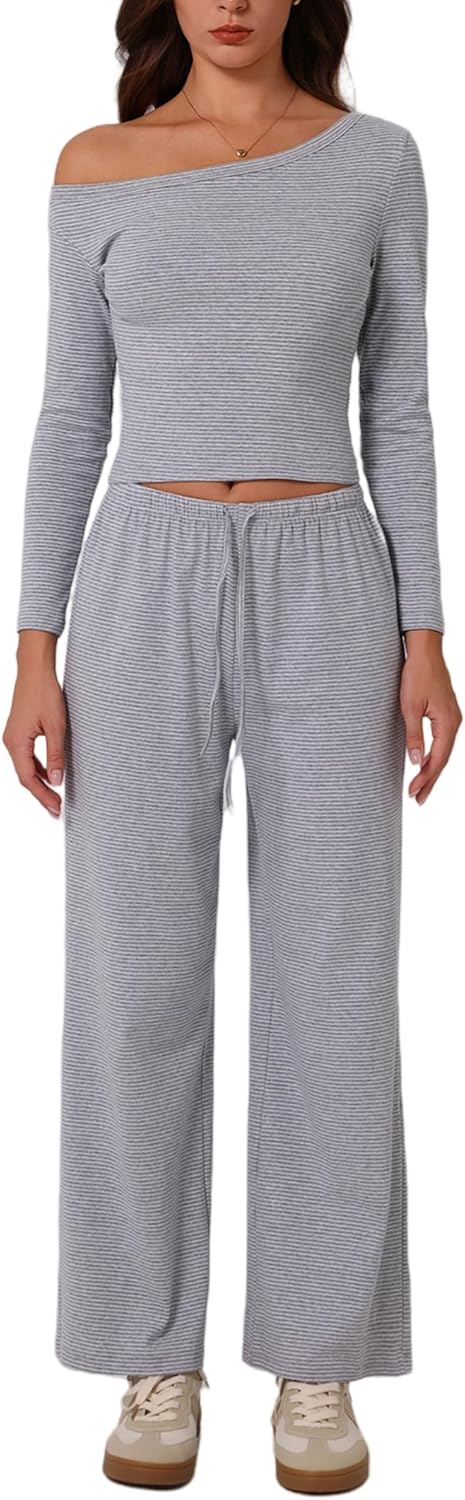 ABOCIW Women's 2 Piece Sets Fall Outfits Striped Off Shoulder Long Sleeve Top Wide Leg Pants Tracksuits Lounge Sets
