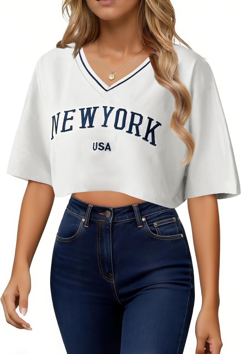 Remidoo Women V Neck Embroidered Short Sleeve Crop Top Graphic Tee Loose Shirts