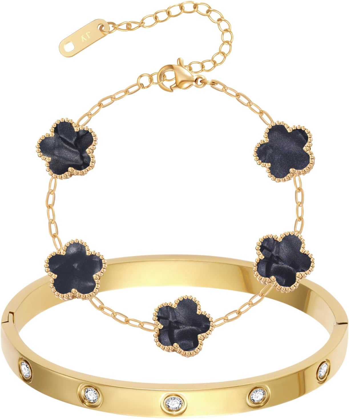 2Pcs Clover Bracelet Set for Women 18K Gold Plated Four Leaf Clover Bracelet Love Bangle Bracelet Stack Lucky Bracelets Gold Link Bracelets Trendy Jewelry Gift for Women Birthday Christmas
