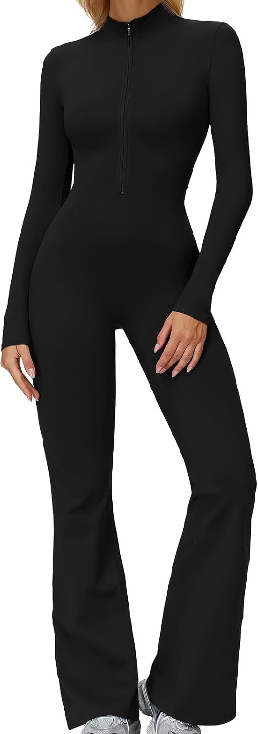 Women Workout Flare Jumpsuit Zip Up Romper Bottom Fleece Lined Long Sleeve One Piece Tummy Control Yoga Outfits