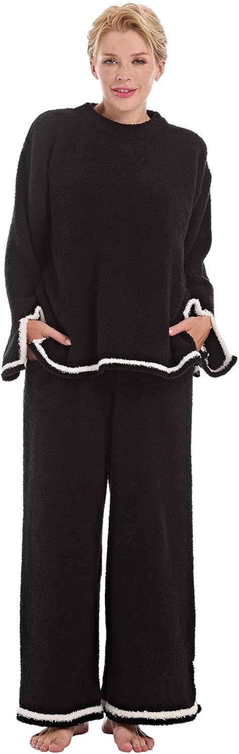 Women’s Fleece 2 Piece Pajamas Fuzzy Long Sleeve Crewneck Wide Leg Winter Sherpa Lounge Sets For Women