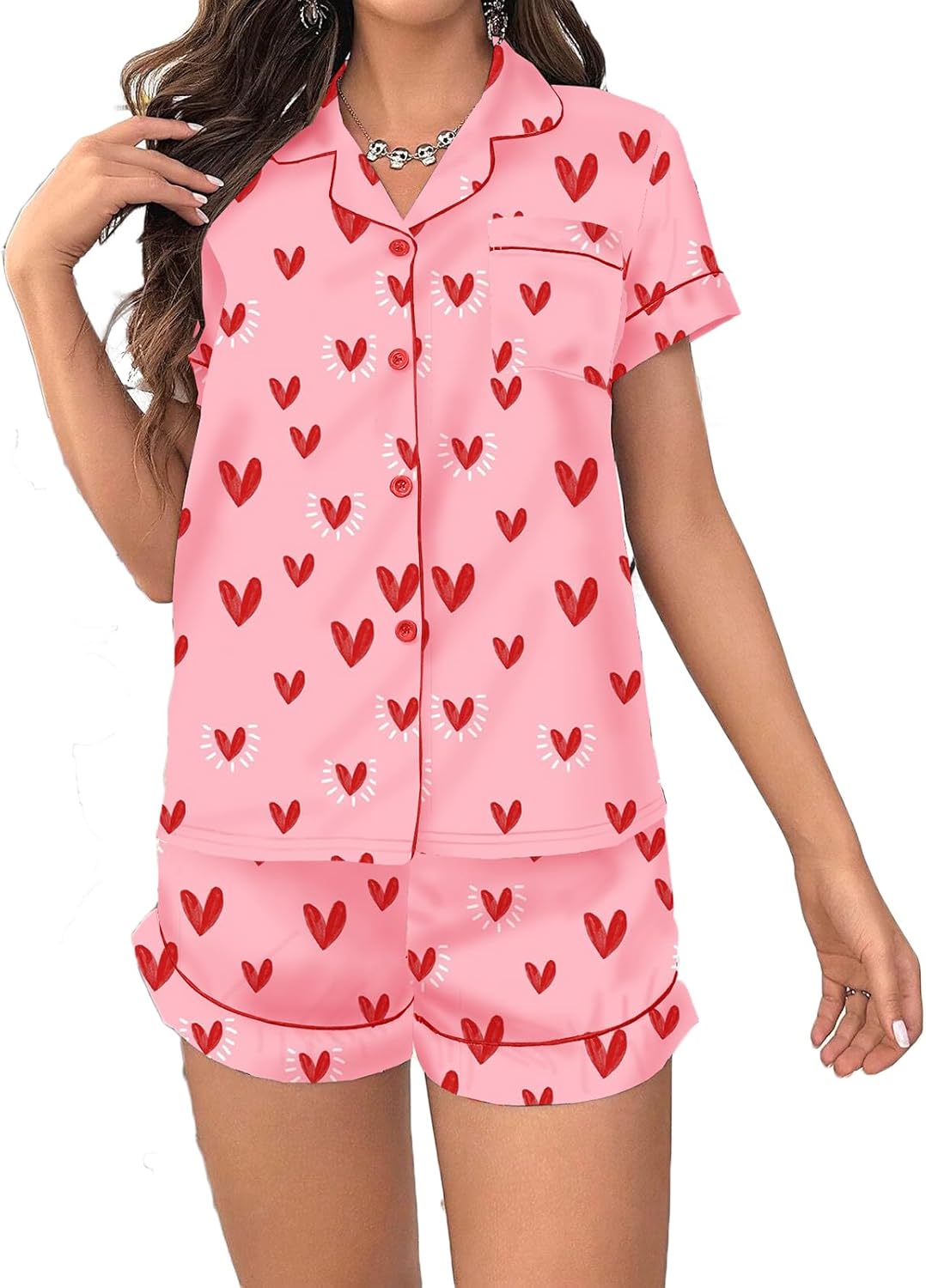 RUEWEY Womens Satin Pajamas Set Heart Print Button Down Shirt Shorts Set 2 Piece Silk Pjs Sleepwear