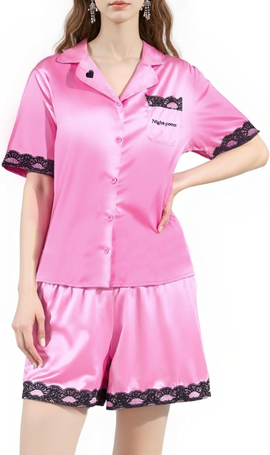Satin Pajamas for Women Set - Silk Shorts Pjs Soft Short Sleeve Button Down with Lace Trim Sleepwear (Eye Mask)
