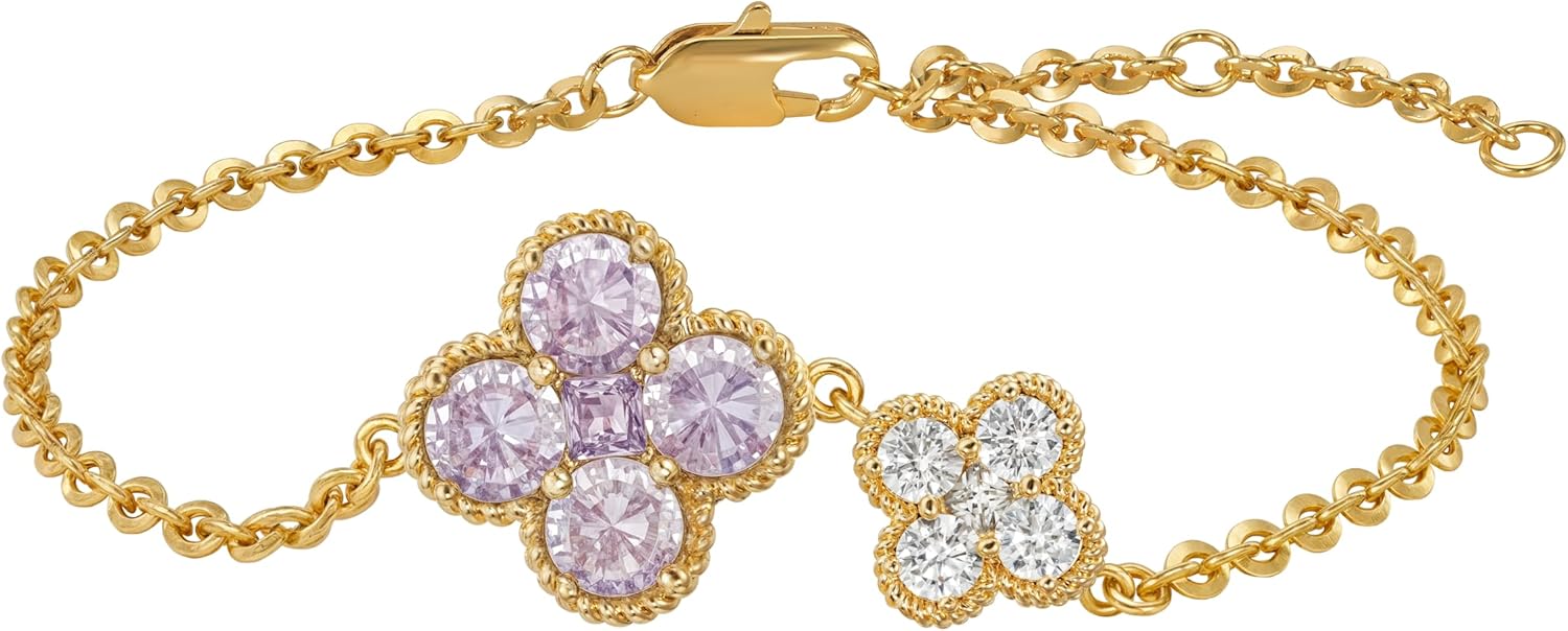 MYEARS Flower Bracelet for Women Gold Sideways Double Four-leaf-clover Link Charm 12 Month Birthstone Cubic Zirconia 14K Simple Dainty Thick Chain Floral Lucky Jewelry Gift