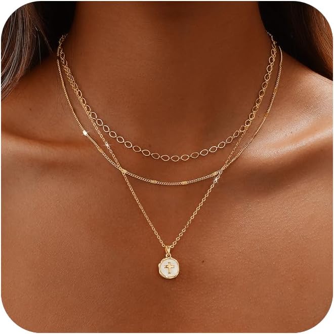 Gold Necklace for Women 14K Gold Plated Layered Cross Bar Necklace Herringbone Figaro Paperclip Flat Chain Cute Charm Accessories Non Tarnish Jewelry Set Gifts for Women