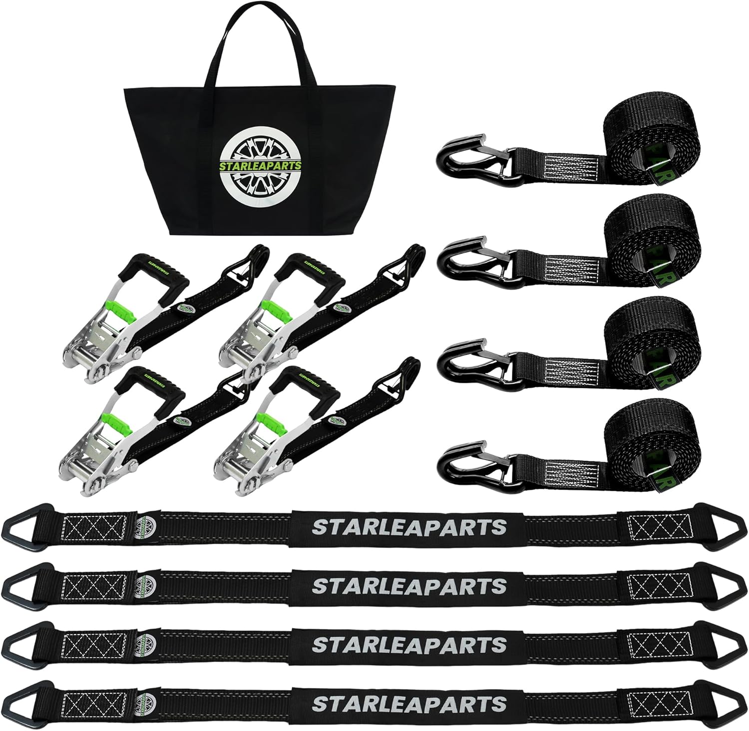 - 【4 Pack 38" Axle Straps+ 4 Wheel Straps】: (4) 38" Heavy Duty Axle Tie Down Straps, (4) Premium 8ft Ratchet Straps, Oversized Storage Bag with (4) Velcro for Securing Excess Strap
