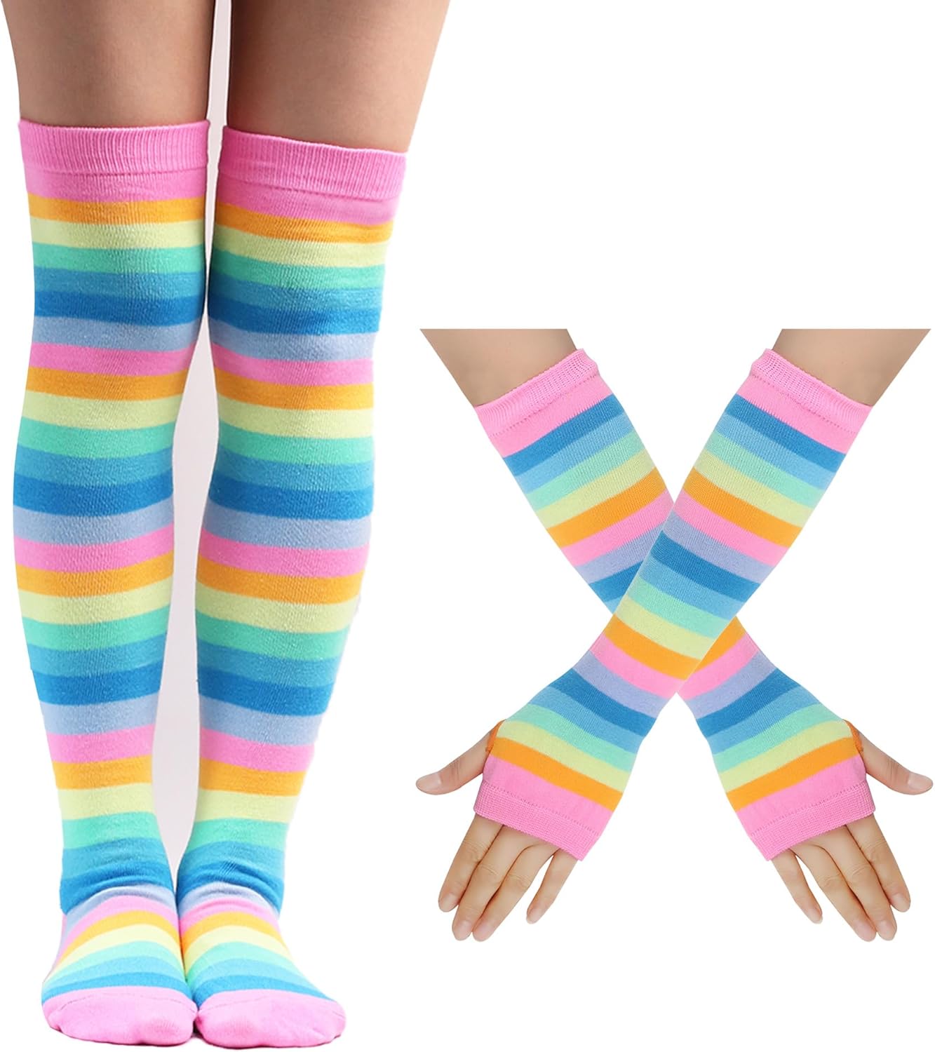 Rainbow Striped Arm Leg Warmers Sleeves Set Rainbow Knee High Socks Warm Fingerless Gloves for Women