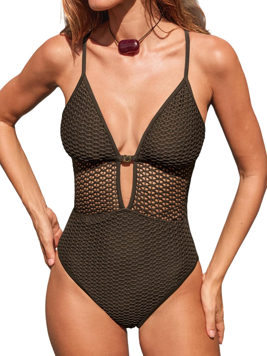 CUPSHE Women's One Piece Swimsuit Plunging Neck Cutouts Bathing Suit Textured Crisscross Back Self Tie Swimwear