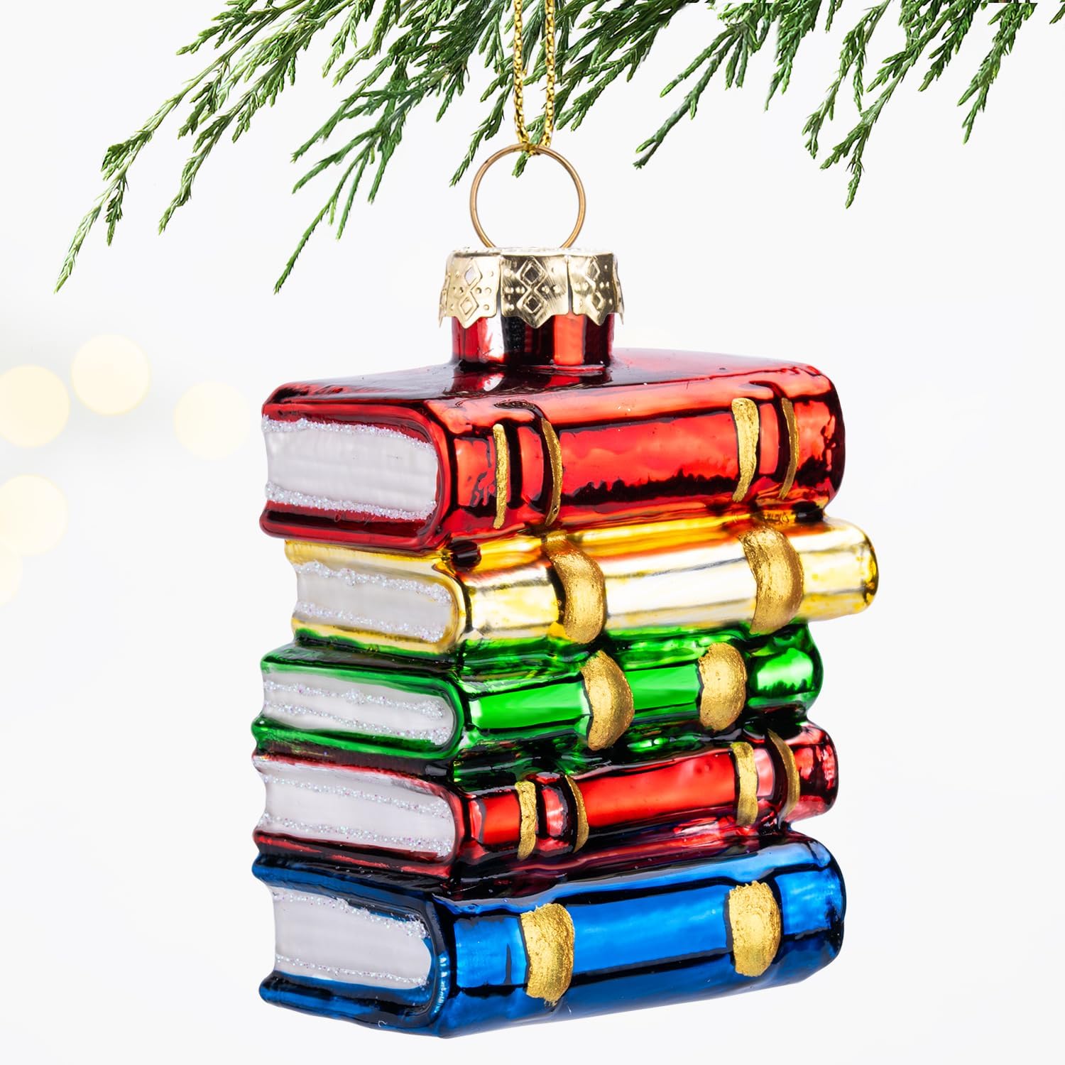 - Realistic Design: Measuring 2.4''×3.1'', this glass ornament features a hand-painted stack of colorful books in vibrant red, gold, green, and blue hues, finished with glossy shine and gold accents. Its bright and cheerful look makes it a charming addition to any Christmas tree or festive display.