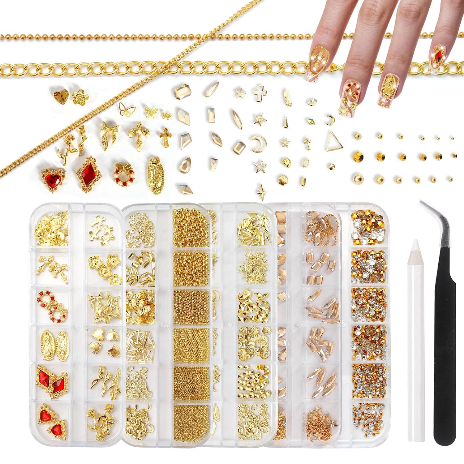 - Nail Art Set: This luxurious gold nail art set includes 5 boxes of accessories: 12 styles of 3D charms (gold roses, crosses, etc.), mixed champagne rhinestones, caviar beads & metal pieces, red gemstone charms, and geometric gold charms. With 3 metal chains, tweezers, and a wax pencil included, it’s perfect for creating salon-level 3D nail art—ideal for both beginners and professionals.
