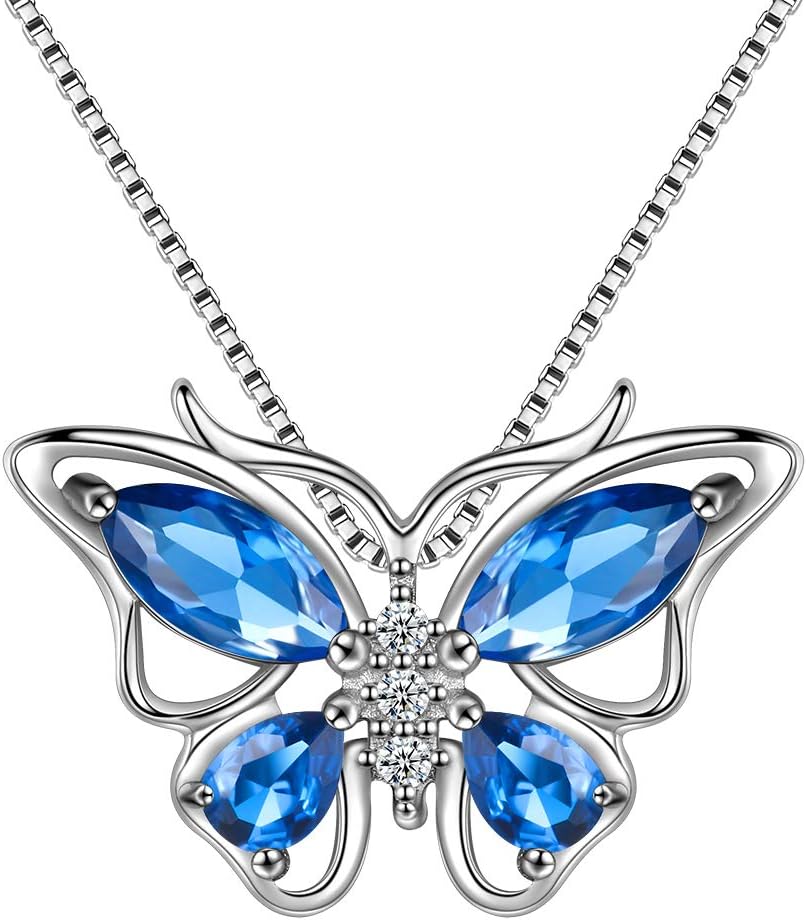 Aurora Tears Butterfly Birthstone Pendant Necklace - Women 925 Sterling Silver Butterflies Birthstone Pendant Necklace Jewelry Birthday Gift for Women
