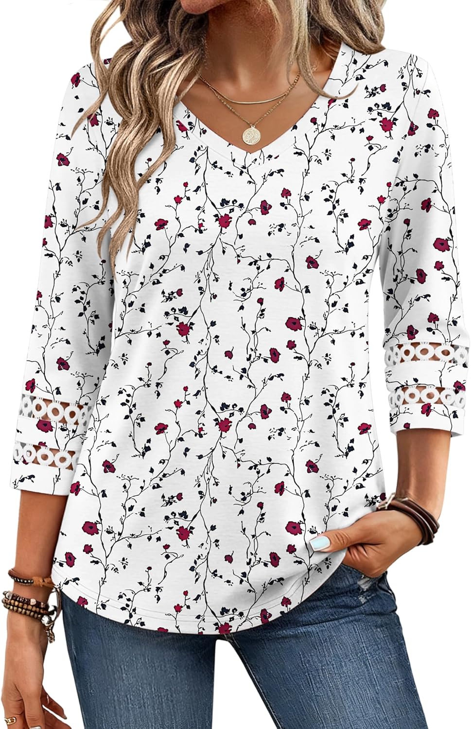 Zeagoo 3/4 Length Sleeve Womens Tops V Neck Dressy Casual Blouses Trendy Eyelet T Shirts Work Clothes S-XXL
