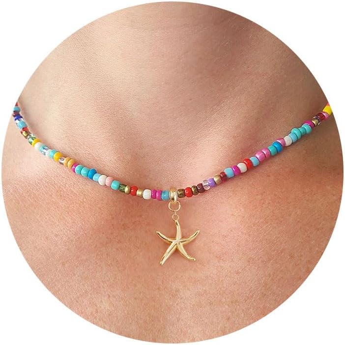 VRIUA Colorful Beaded Necklaces for Women – Summer Beach Boho Starfish, Conch, Shell, Pearl, Palm tree Pendant Necklace Jewelry