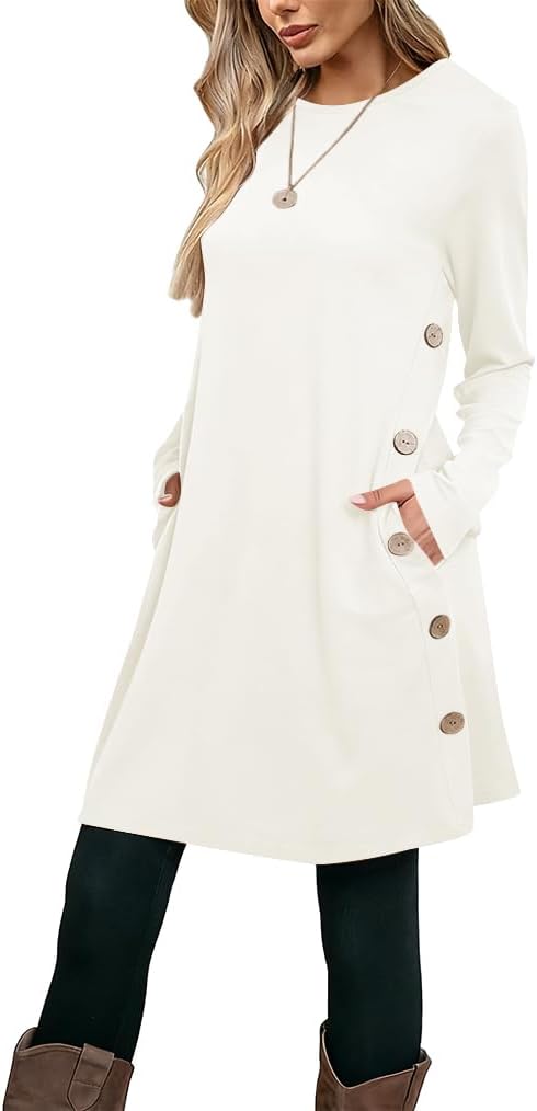 Poetsky Womens Tunic or Tops to Wear with Leggings Long Sleeve Side Buttons Swing Casual Long Shirts with Pockets S-3XL