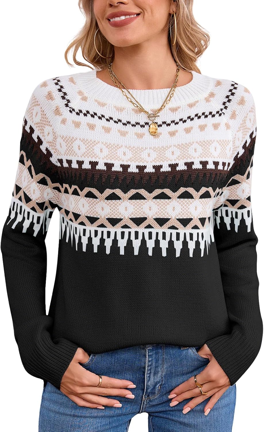 Alsol Lamesa Women's Fair Isle Sweater Casual Crewneck Long Sleeve Heart Sweater Vintage Knit Jumper Tops