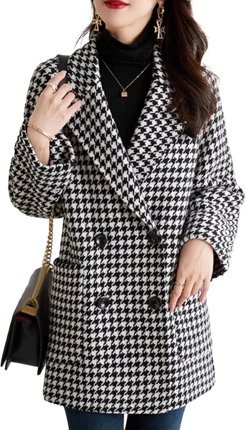 SOMTHRON Women's Houndstooth Blazer Jackets Double Breasted Notch Lapel Trench Coat Peacoat Plaid Overcoat