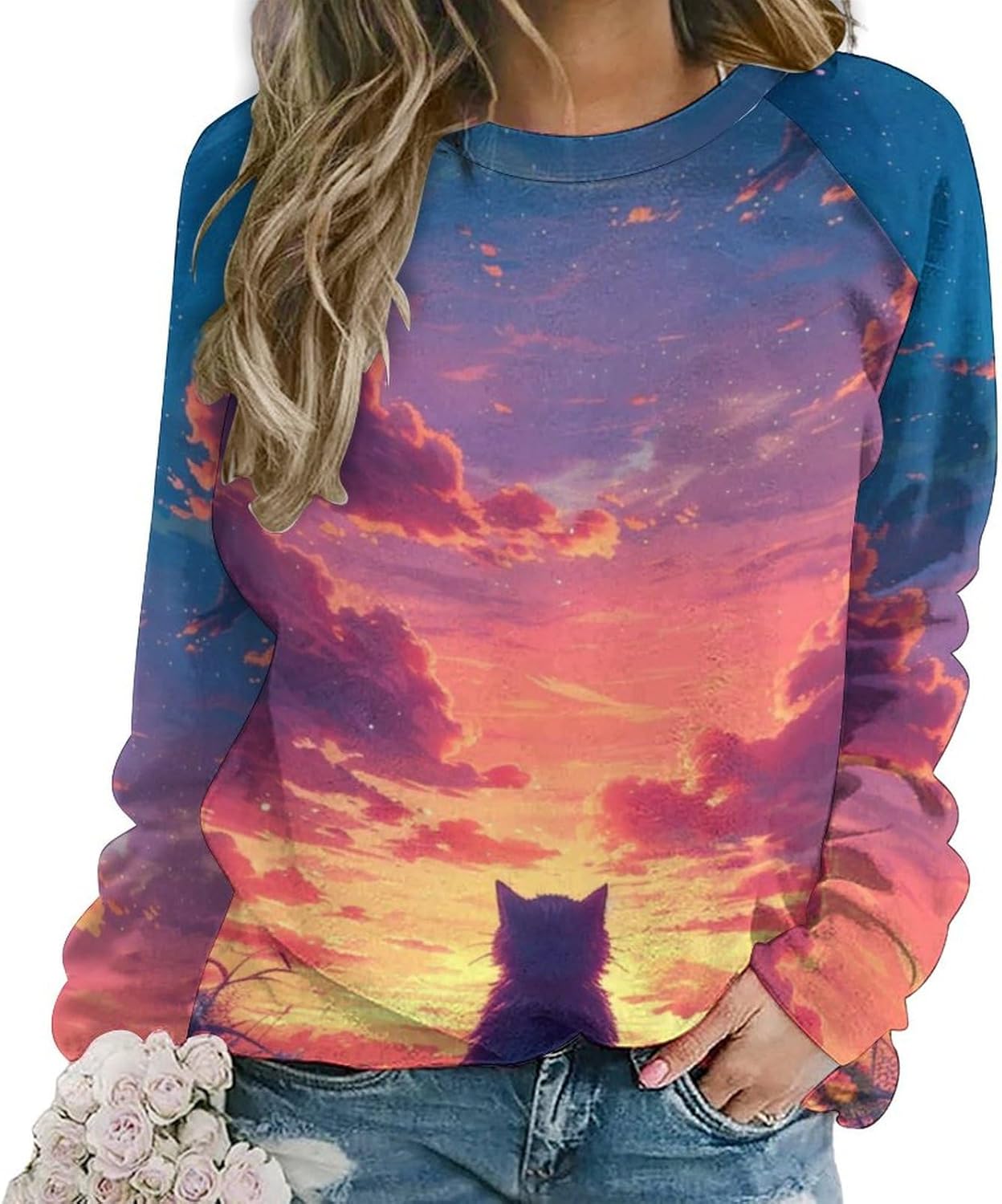 Long Sleeve Shirts for Women Cat Printed Fall Winter Dressy Holiday Casual Fashion Crewneck Tunic Tee Shirts