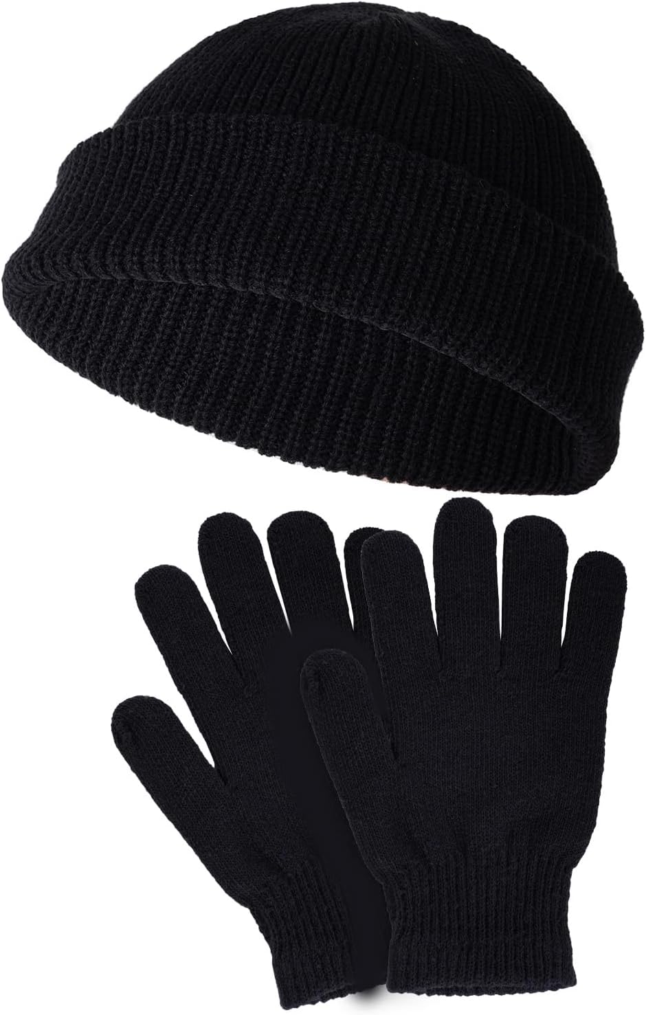 Winter Knit Beanie Hat and Gloves Set for Men Women, Soft Warm Skull Cap Stretchy Gloves Set for Cold Weather