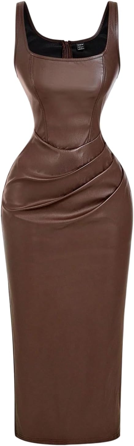 SHENHE Women's Faux Leather Dress Sleeveless Ruched Bodycon Slit Evening Party Midi Dress
