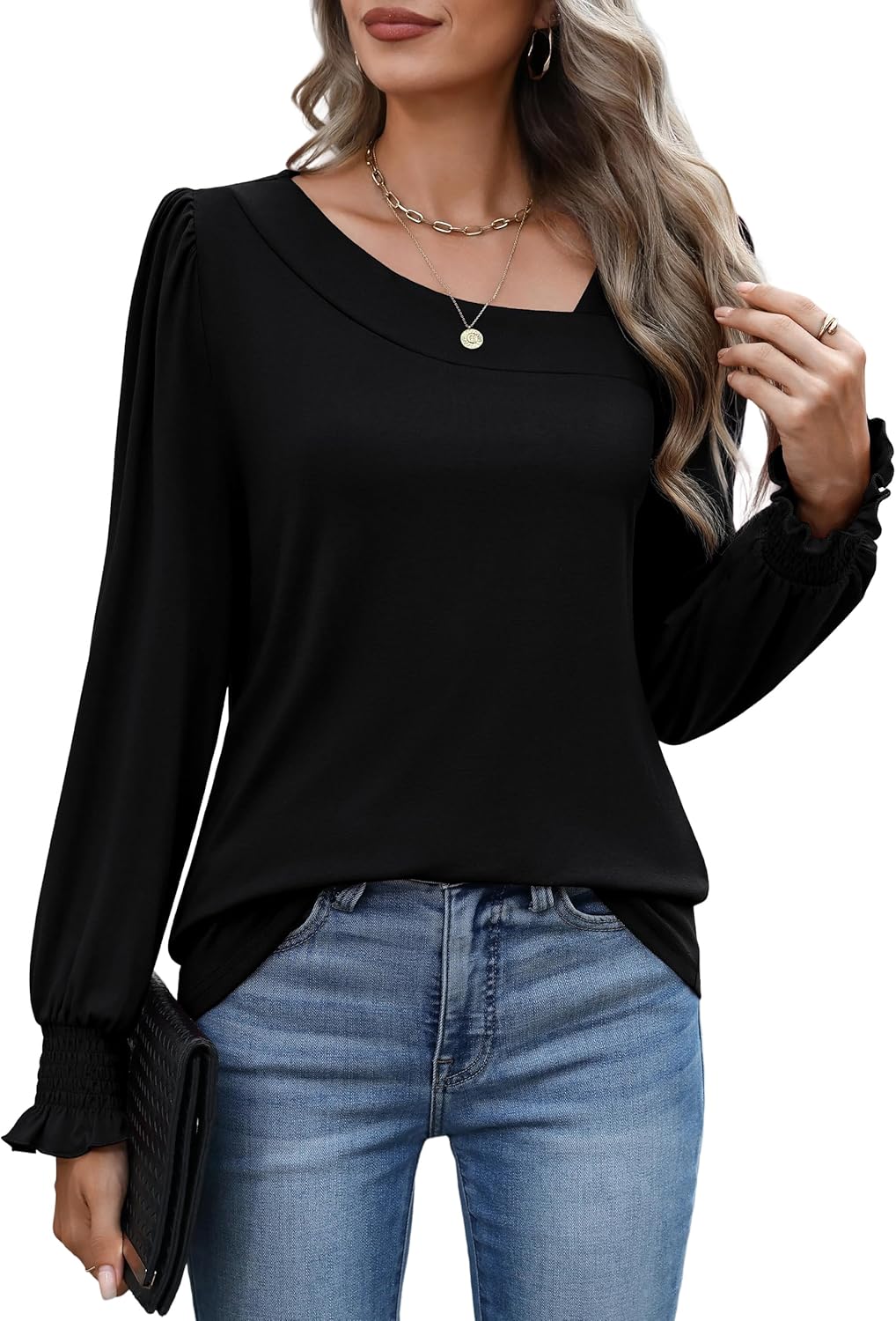 Fayenne Womens Long Sleeve Shirts Business Casual Asymmetrical Neck Tops Trendy Blouses Fall Outfits with Smocked Cuffs