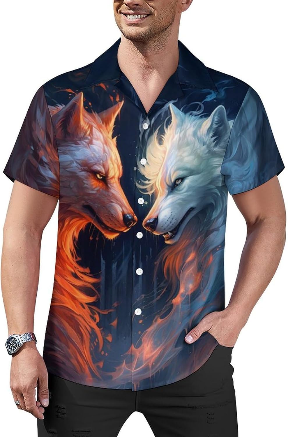 Mens Hawaiian Wolf Shirt Casual Button Down Shirts Short Sleeve Aloha Trippy Shirt