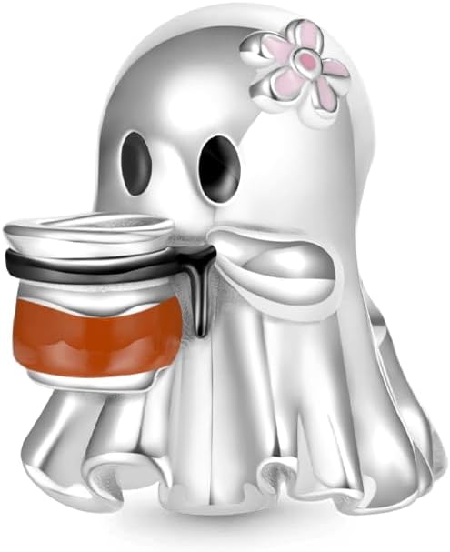 GNOCE Halloween Ghost Drinking Coffee Charm Sterling Silver Bead Halloween Charm Fit Bracelet/Necklace for Women Wife/Jewelry Gift