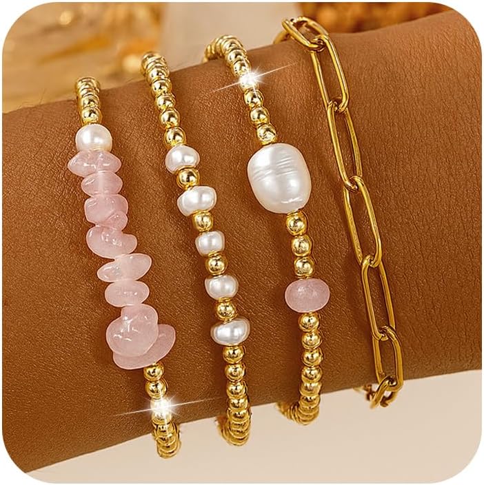 Gold Beaded Bracelets for Women Handmade Pearl Colorful Crystal Paperclip Link Chain Bracelet Stack Stretch Elastic Boho 14K Gold Plated Beads Stackable Trendy Jewelry Friendship Gift