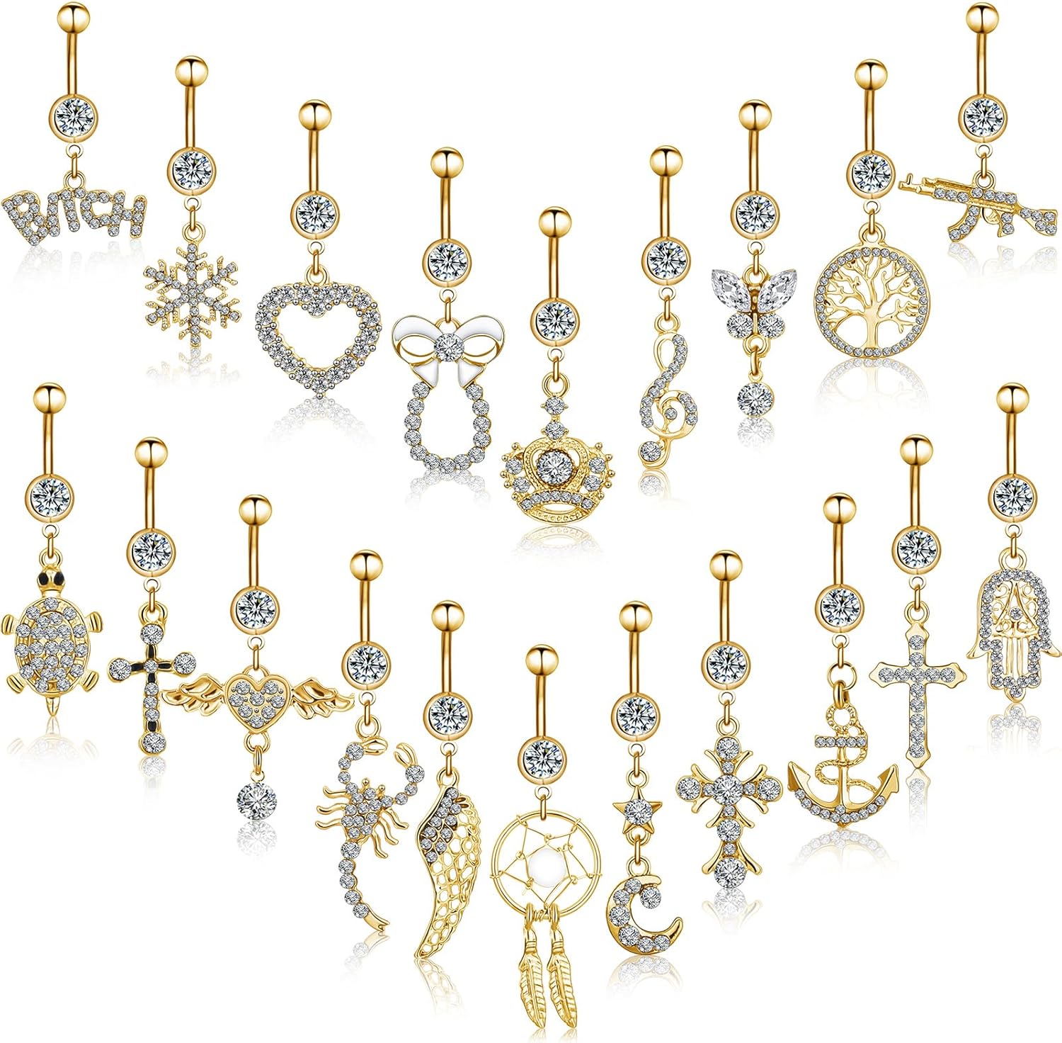 Junkin 20 Pcs 14G Dangle Belly Button Ring, Dangling 316L Surgical Navel Rings Cubic Zirconia Belly Piercing Jewelry