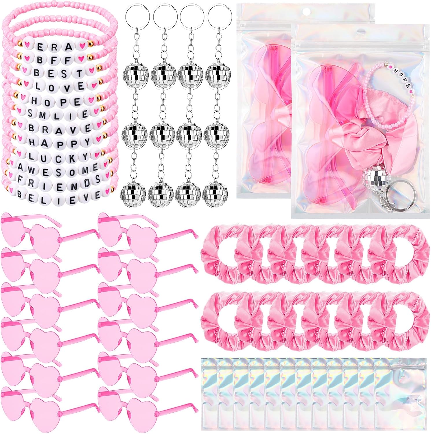Geiserailie 60 Pcs Kpop Party Favors Popular Singer Supplies Friendship Bracelets Disco Keychain Sunglasses Holographic Scrunchie Set Bags 12 Set Friendship Gifts for Kpop Fans Women(Pink)
