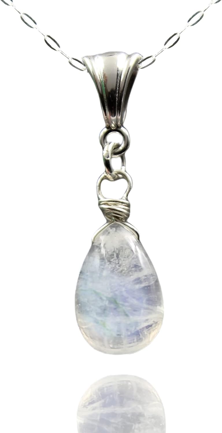 LND Natural Rainbow Moonstone Pendant, White Gemstone Necklace for Her, June Birthstone Jewelry, Teardrop, Gift For Women, 925 Sterling Silver, 18 Inch Chain (Bail)