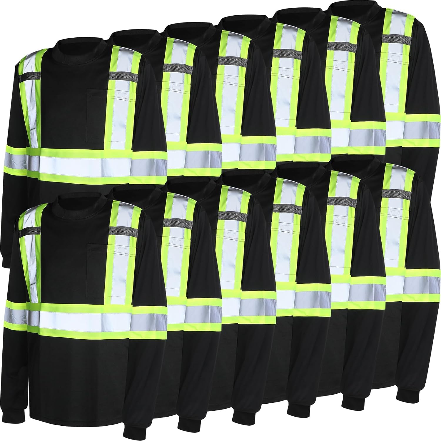 Panitay 12 Pcs Safety Long Sleeve Shirts Bulk Class 3 Reflective High Visibility Shirts with Pocket Black Safety