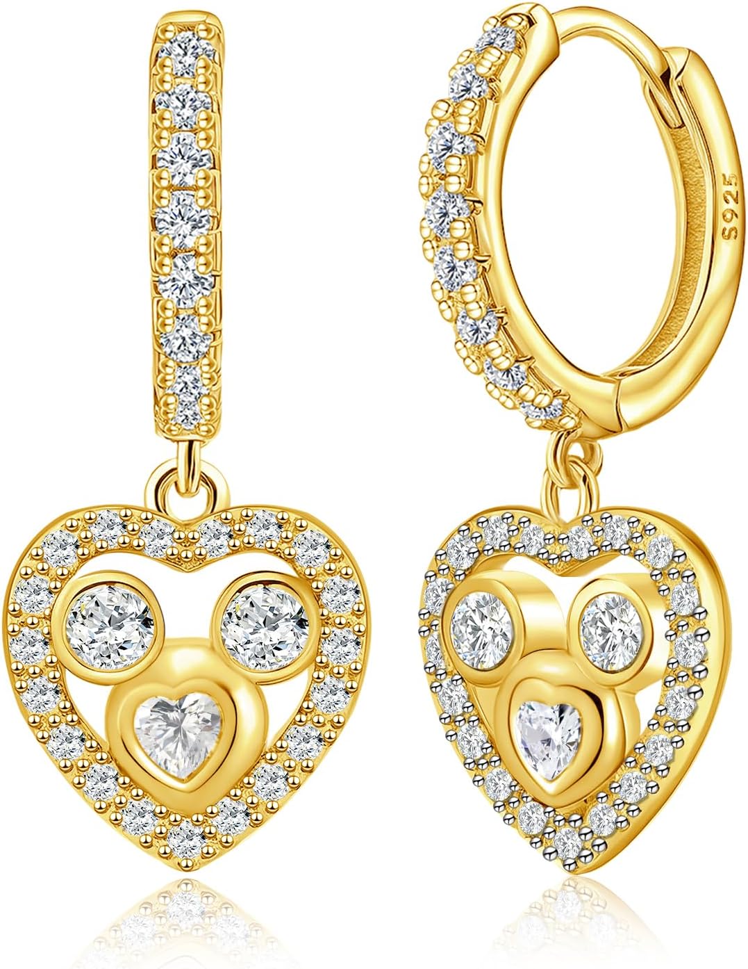 Mouse Earrings 14k Gold Sterling Silver Mouse Heart Hoop Earrings with Sparkling Cubic Zirconia Cute Animal Dangle Hoop Earrings Jewelry for Women Daughter Mom Wife Girlfriend Birthday Party