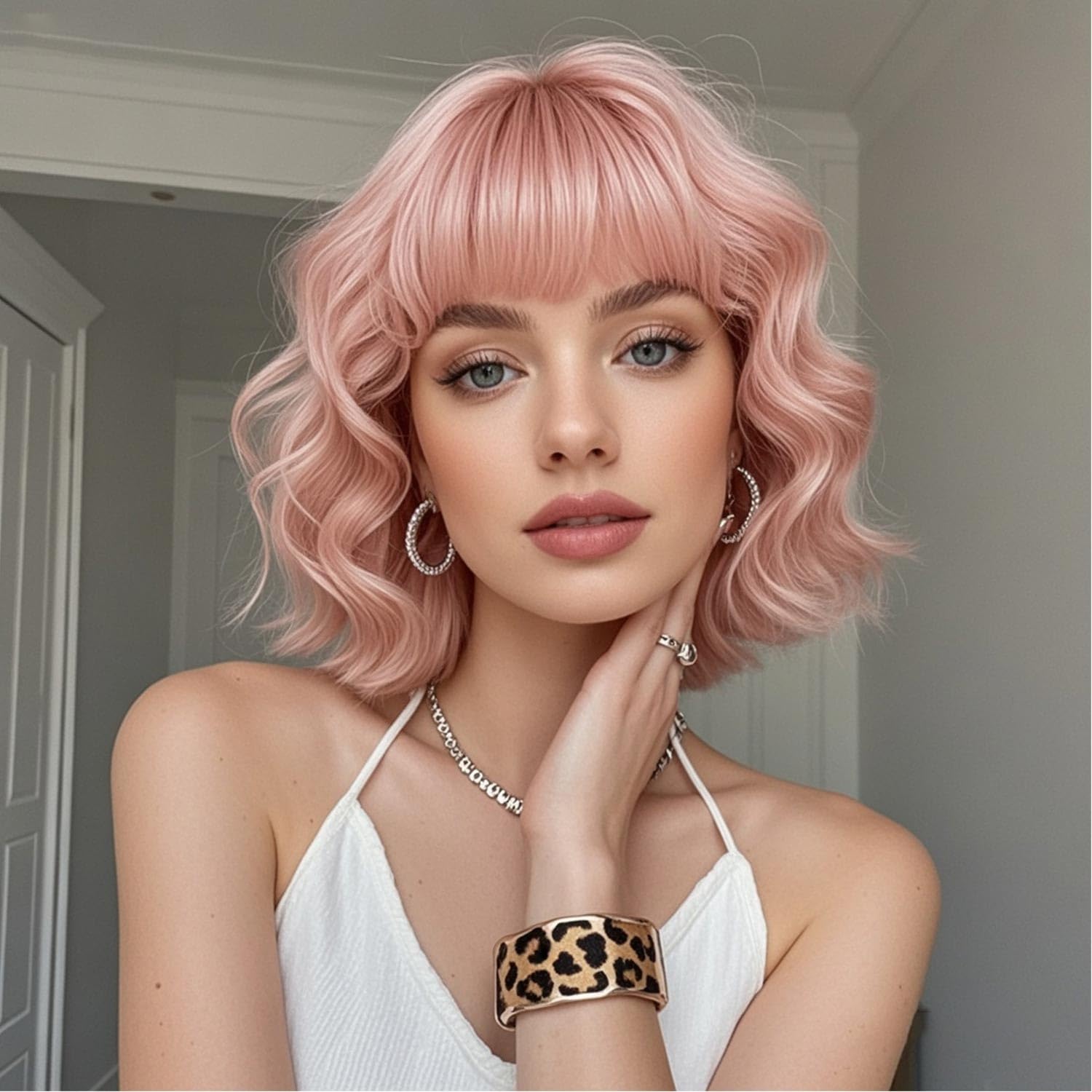 - Simulated Scalp Aesthetics: The wavy bob wig with bangs synthetic wigs feature a realistic color gradient that mimics natural scalp tones, with undetectable parting tracks at the crown for seamless blending.