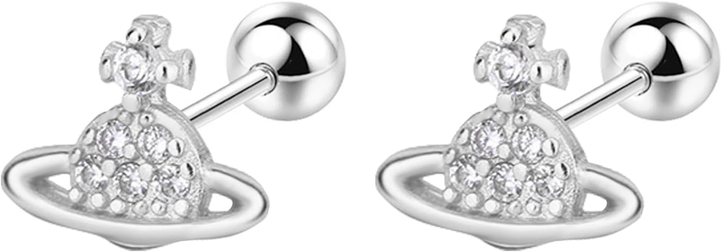 20G Tiny Cute Saturn Stud Earrings for Women Silver Plated Cubic Zirconia Planet Aesthetic Y2k Earring Small Ball Screw Back Studs Mini Cartilage Tragus Long Post Dainty Space Jewelry Gifts