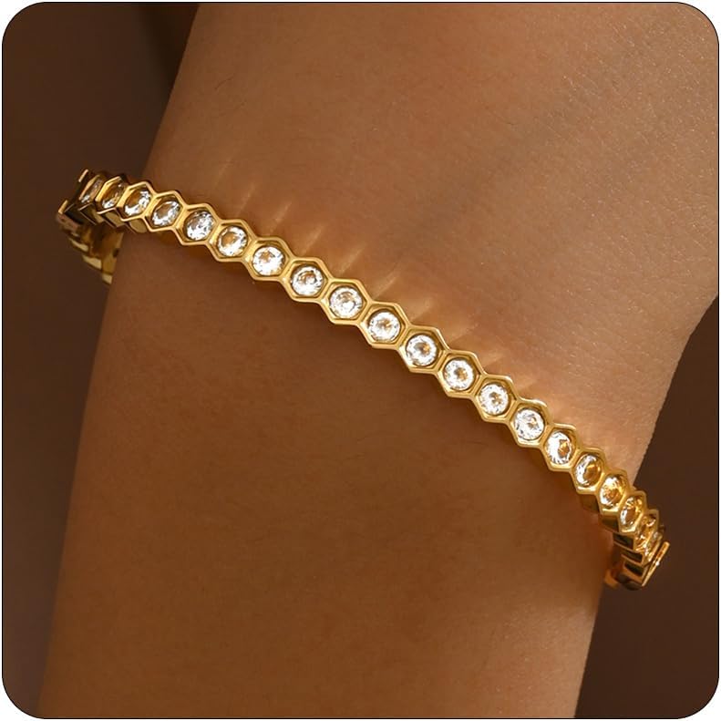 Bangle for Women 18K Gold Plated Dainty Cubic Zironia Bracelets Dainty Heart Hollow Out Honeycomb Stainless Steel Bangle Bracelet Classic Bangle Gifts