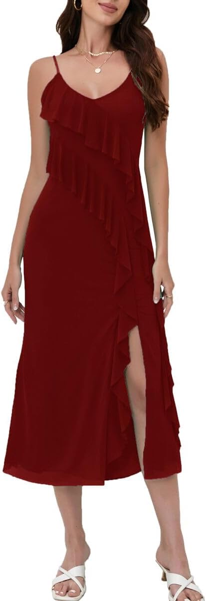 Women's Spaghetti Strap Ruffle Side Split Long Dress Bodycon Beach Maxi Dresses