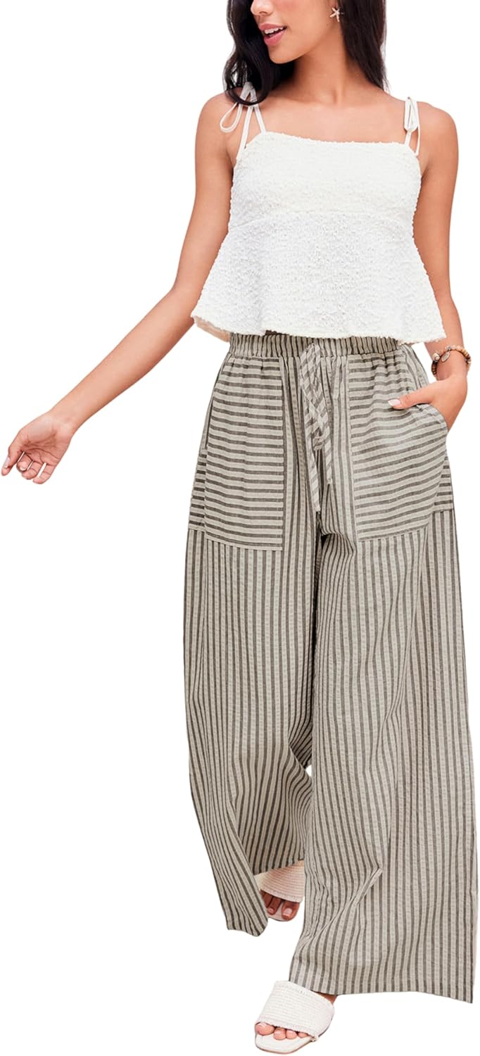 Yeokou Women's Wide Leg Pants Drawstring Striped Cotton Mid Rise Casual Long Palazzo Trousers with Pockets