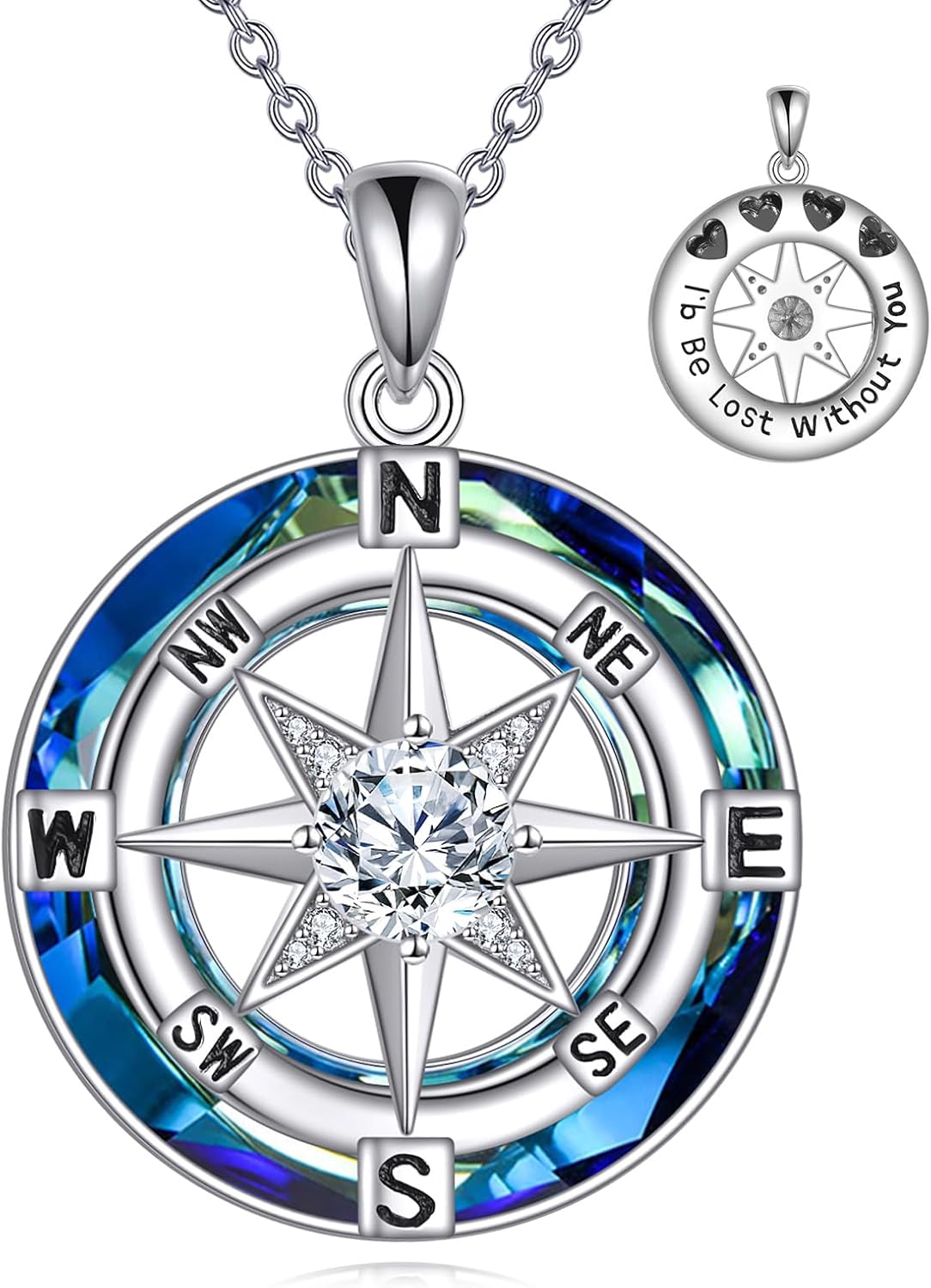 CRMAD Compass Necklace Sterling Silver Moissanite Pendant Blue Crystal Jewelry Birthstone Anniversary Graduation Gifts for Women Men