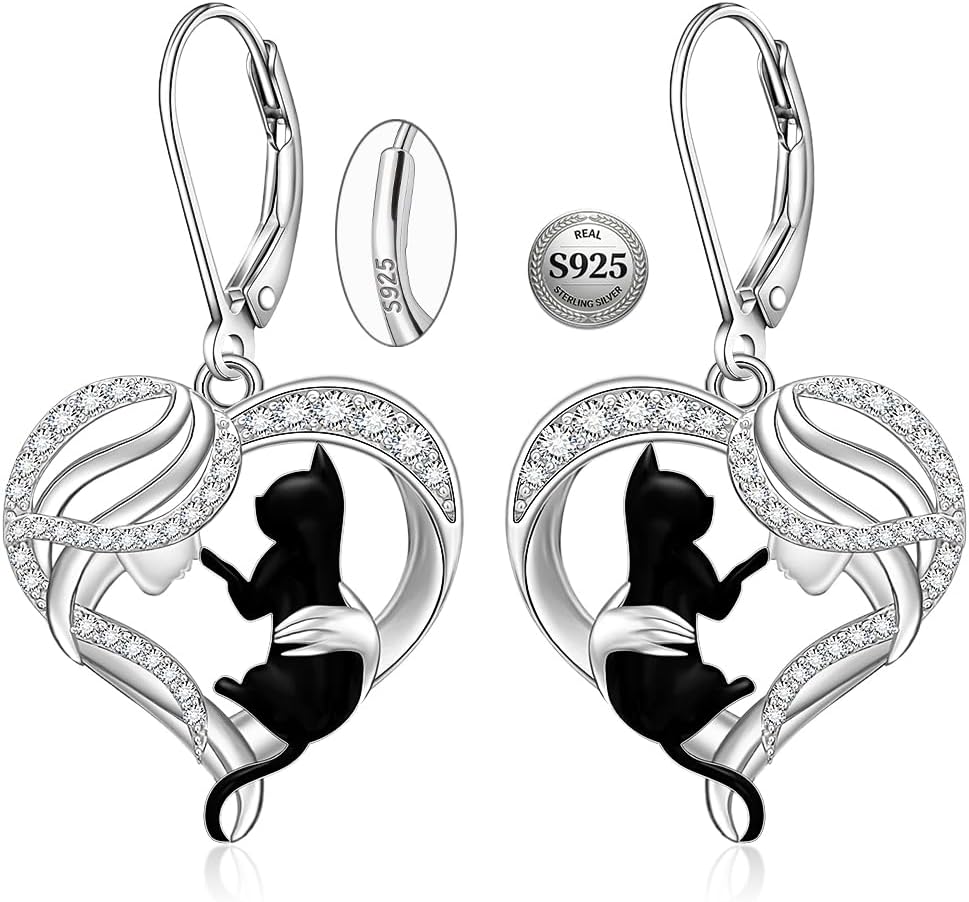 Black Cat Earrings for Women Cat Sterling Silver Earrings Dangle Leverback Halloween Christmas Jewelry Cute Cats Gifts