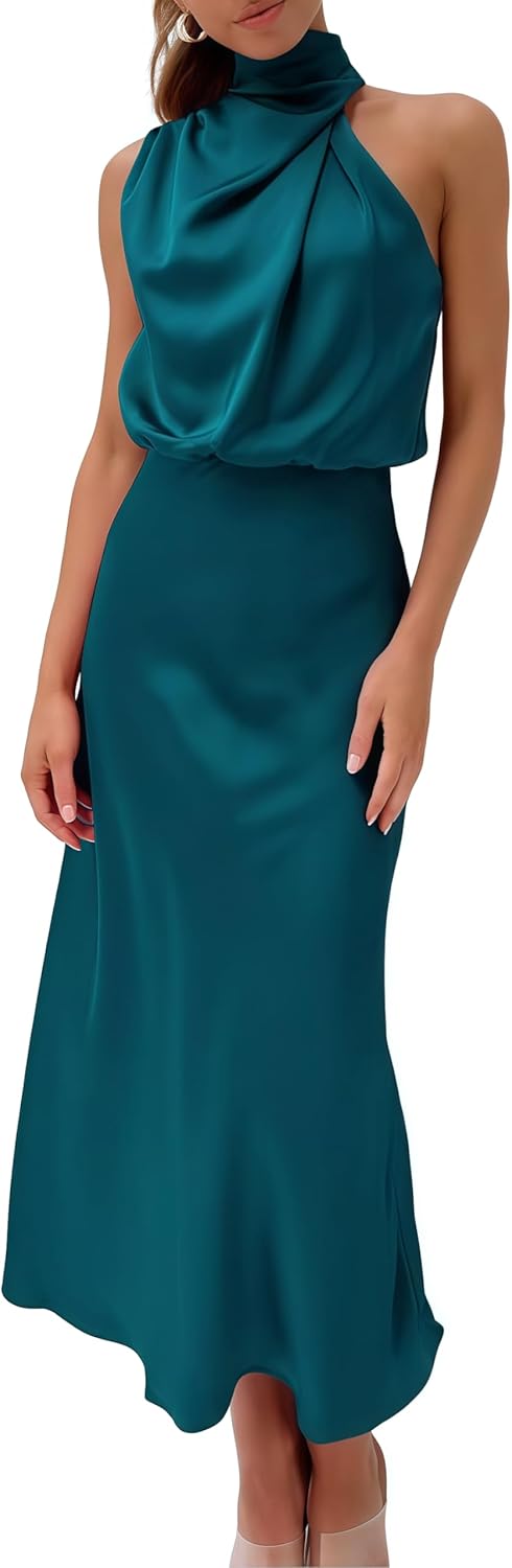 Mettclasi Women's Spring Summer Satin Sleeveless Halter Maxi Dress Elegant Formal Mock Neck Cocktail Party Evening Dress