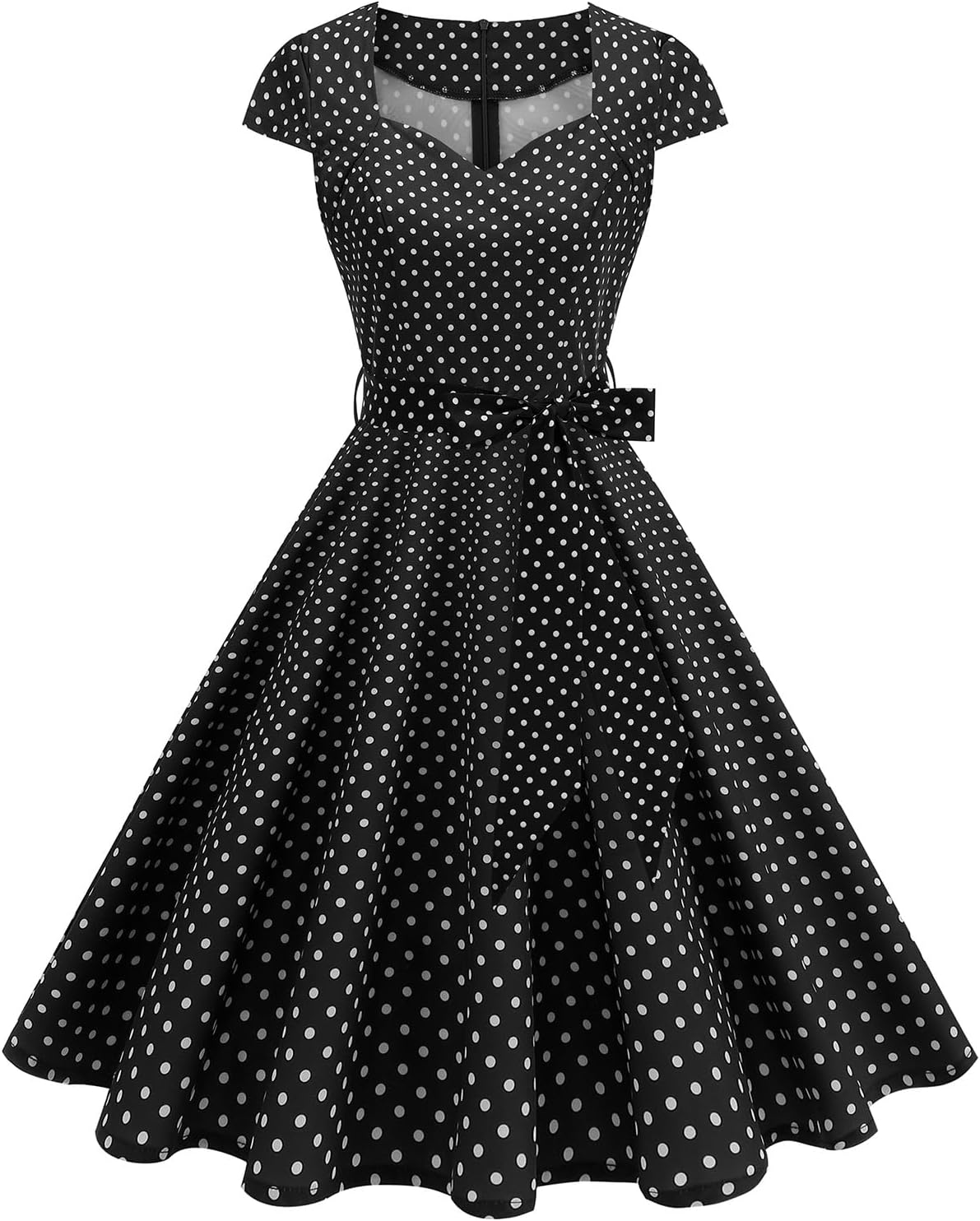 Women's Retro Formal Cocktail Party Dresses 1950s Cap Sleeve Polka Dot Swing Dress with Belt for Wedding Church