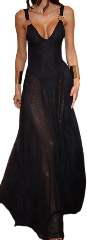 Women's Sexy Deep V-Neck Retro Sleeveless Solid Color Mesh A-line Dress Lace Cocktail Party Wedding Dress