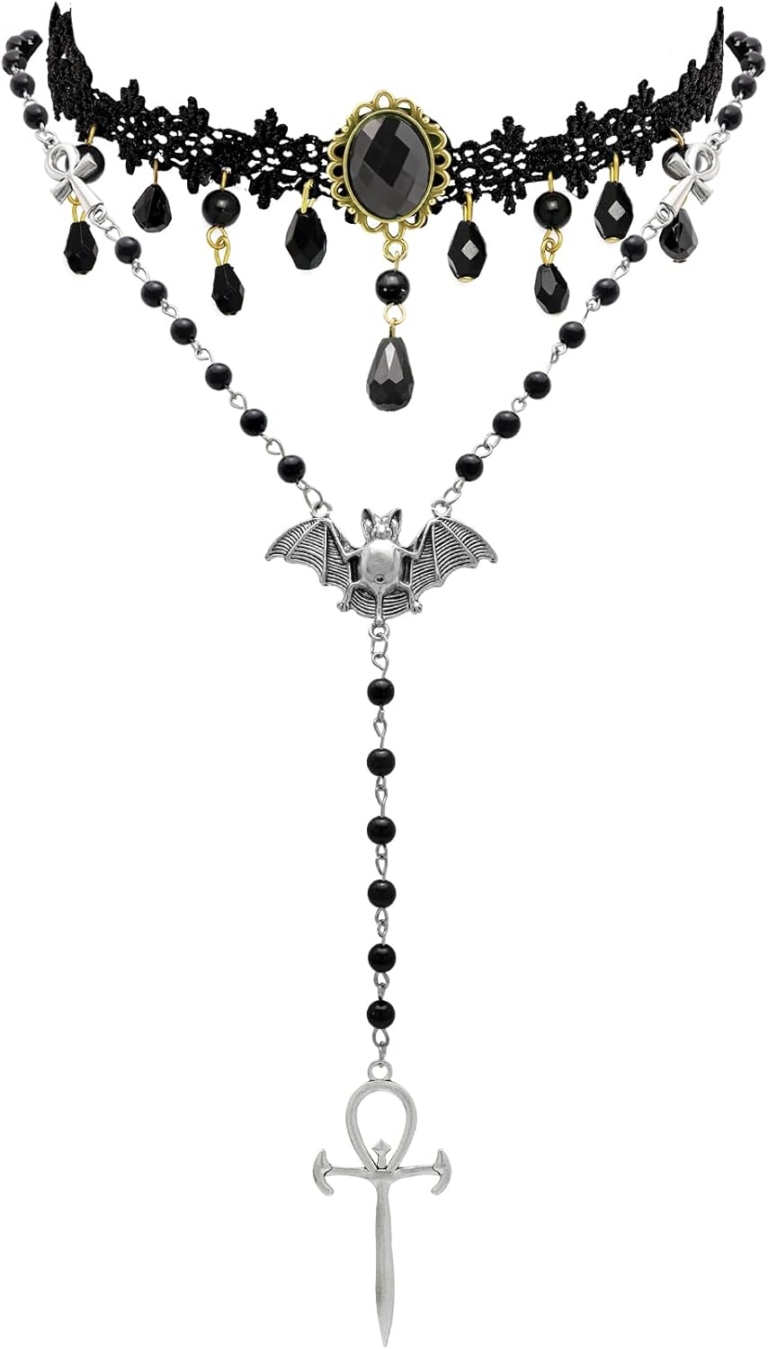 2pcs Halloween Gothic Necklaces Jewelry Set for Women Black Lace Collar Choker Ankh Cross Bat Necklace Goth Long Rosary Beads with Chunky Cross Pendant Necklace Gothic Vampire Accessory