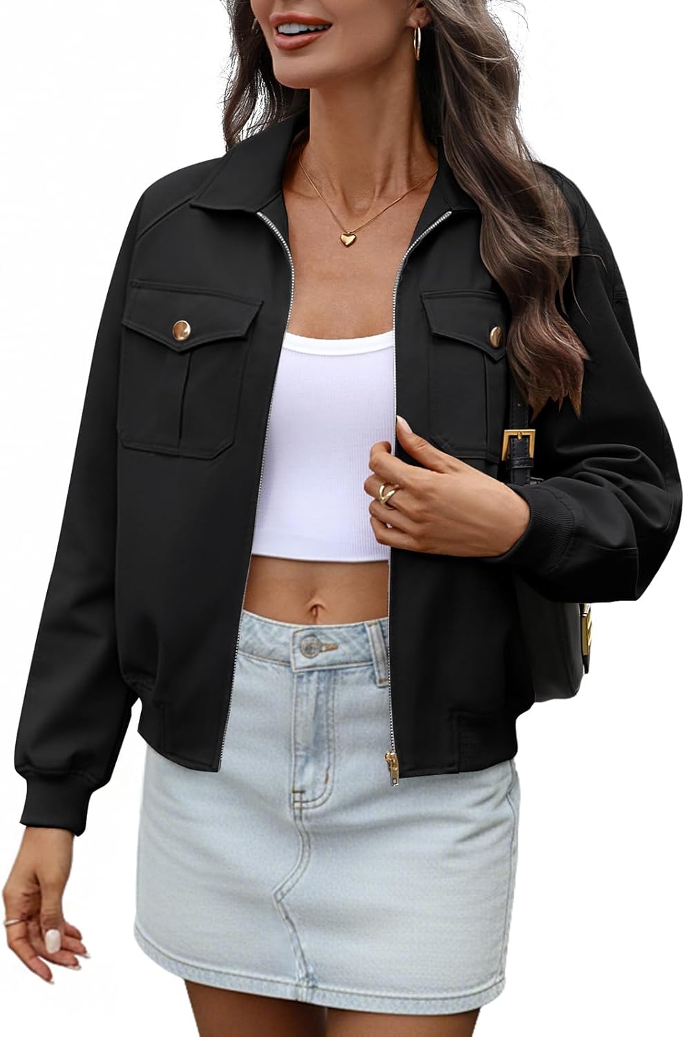 Women's Crop Zip Up Bomber Jacket Long Sleeve Collar Ribbed Hem Oversize Casual Jackets Cotton Tencel Chest Pockets