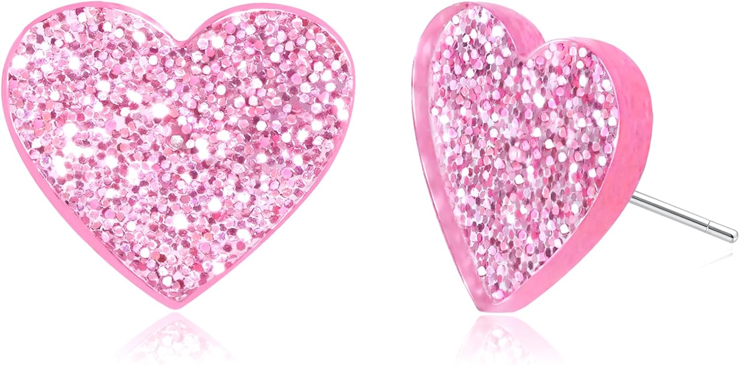 yfstyle Valentines Small Pink Heart Earring Studs Acrylic Glitter Minimalist Heart Earrings for Women Valentines Lover Jewelry Gifts