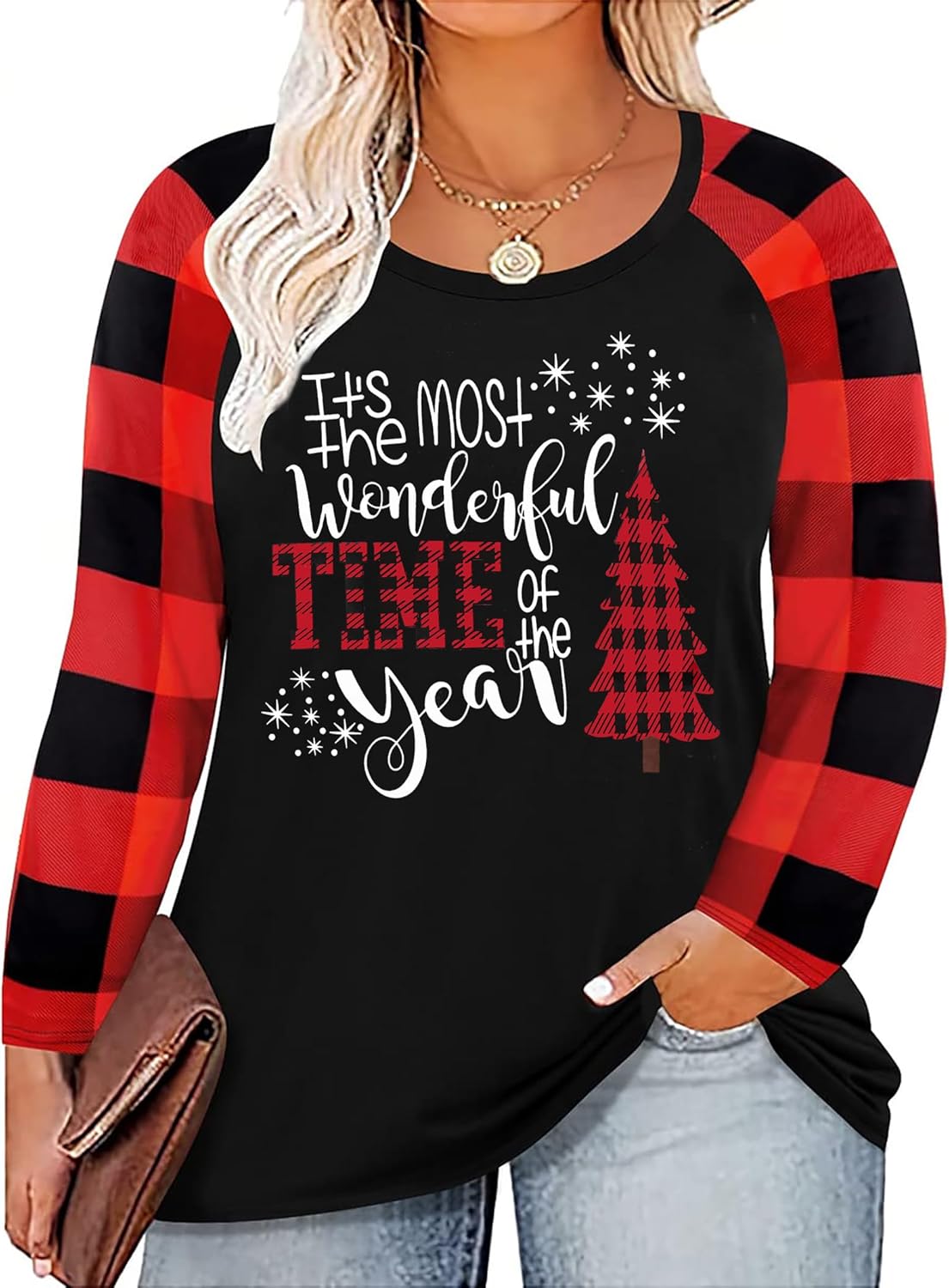 Plus Size Merry Christmas Shirts Women Xmas Buffalo Plaid Tree Shirt Long Oversized Graphic Tees Xmas Tops